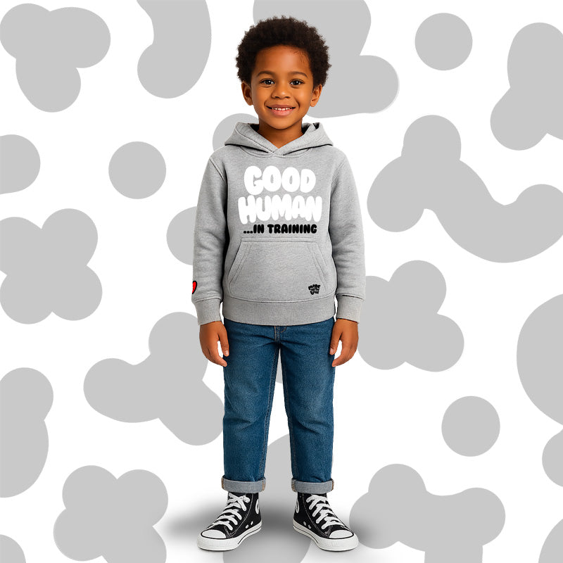 Start them young on the path to kindness with the Good Human…In Training hoodie. Designed for comfort and impact, this cozy heather gray pullover reminds us that being a “Good Human” is something we all practice every day.